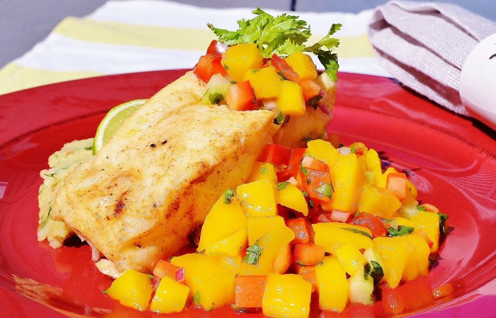 (English recipe follows…) Delray Beach, c’est le soleil de Floride. C’est le refuge de mon père et de sa blonde Nicole pour fuir la neige et la gadoue, pendant les longs mois d’hiver… J’ai eu la chance de passer une semaine à Delray l’an dernier, et y ai joué mon premier 18 trous de golf à vie. Je vous propose un remake d’un « pas pire » souper que j’avais préparé à mes hôtes. Il s’agit de beaux pavés de poisson marinés puis poêlés, servis avec une salsa de mangue et une purée de pommes de terre épicée. La salsa de Delray provenait du marché local, soit le Boys’ market, là où les empilades de fruits, légumes et produits du monde entier défient par miracle la loi de la gravité. Je suis plutôt fière de ma salsa, qui est aussi fraîche et savoureuse que sa cousine floridienne…