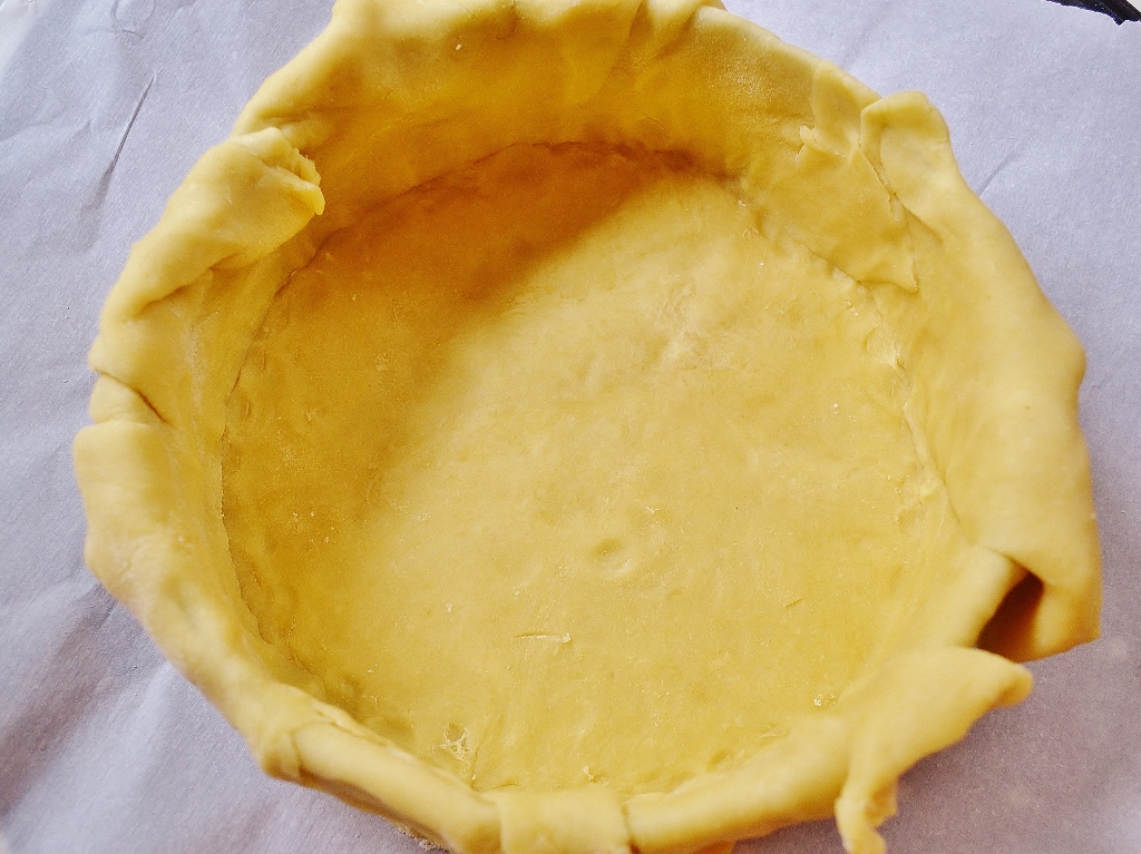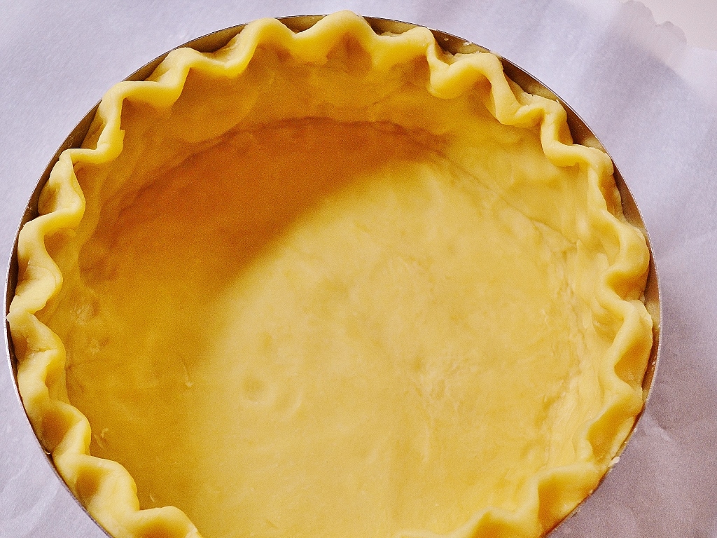 Abaisser une pâte brisée. Mettre le cercle à pâtisserie sur une plaque recouverte de papier parchemin. Y déposer la pâte, en pressant bien partout, délicatement,  pour bien ajuster l’abaisse à la forme du cercle. Avec les doigts, faire un joli motif avec la bordure de pâte comme sur la photo de droite, ci-dessous.