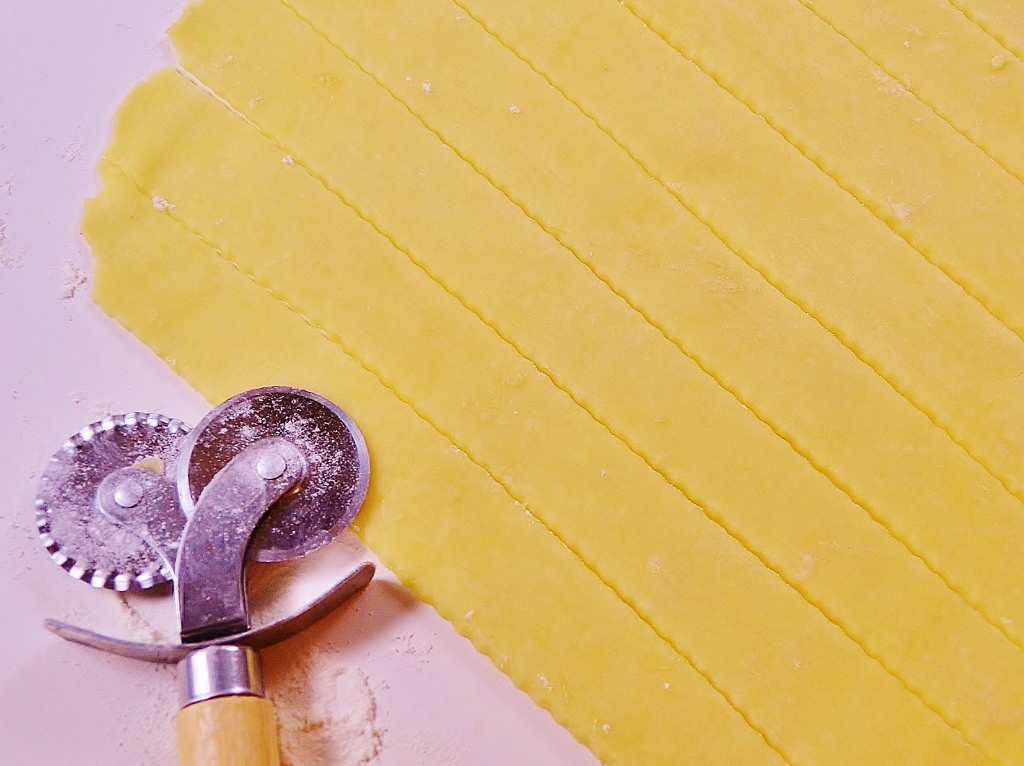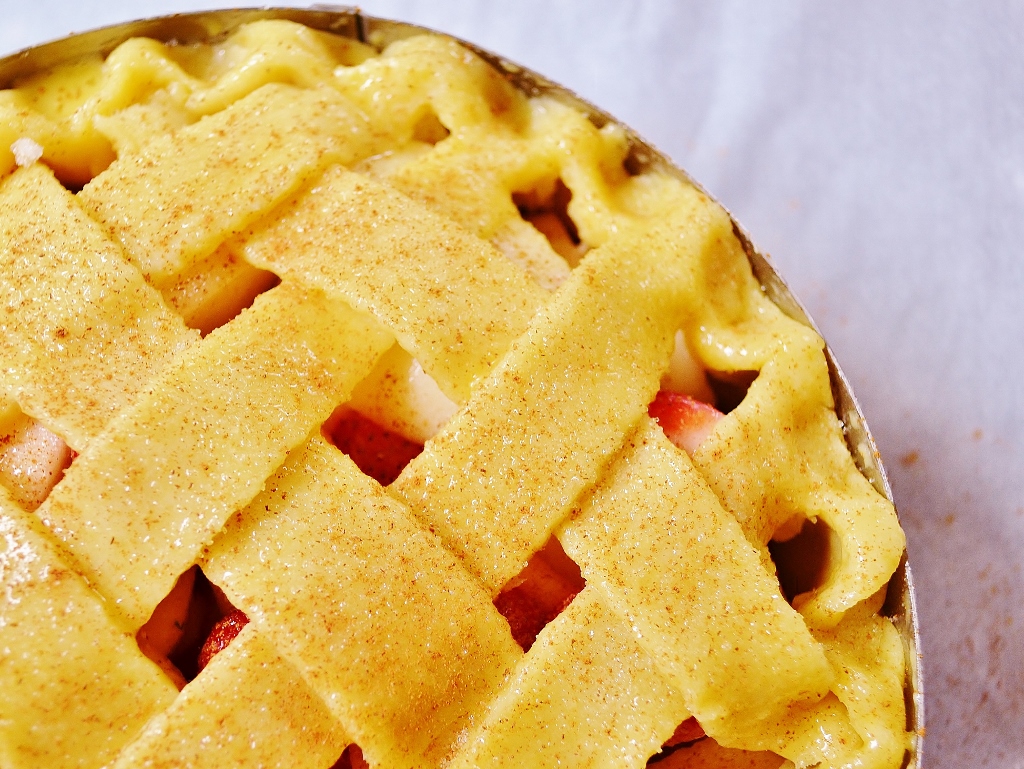 Prepare the lattice top using 1/2 pie dough recipe, and about 8 pastry bands… Fix the bands to the pie using egg (beaten). Sprinkle a little sugar and cinnamon on the pie.