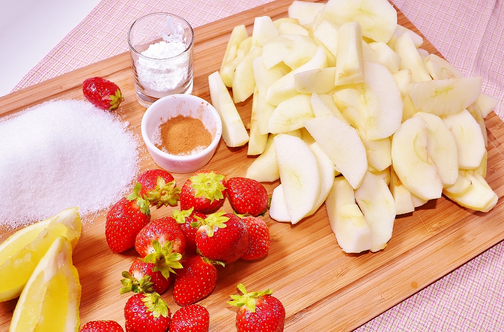 5 pommes, pelées et tranchées + quelques fraises coupées en 2 (optionnel)