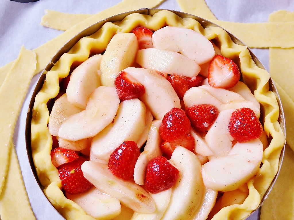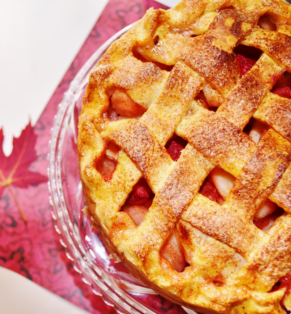 (English follows French)La présente tarte n’a rien de très original… on la retrouve dans presque toutes les familles québécoises une fois venu le temps des pommes. Pommes, sucre, cannelle, un peu de citron et de fécule…  J’y ai mis quelques fraises car j’en avais envie, et j’avoue que la petite touche de rouge me plaît beaucoup. Mon objectif d’aujourd’hui n’est pas de vous montrer une recette révolutionnaire, mais de vous montrer une façon différente de présenter votre tarte, à l’aide d’un cercle à pâtisserie, afin d’obtenir une tarte en hauteur et super chic. Le petit damier de bandelettes ajoute la touche finale à cette jolie pièce… Franchement, je la trouve pas mal, pour une tarte des plus classiques!