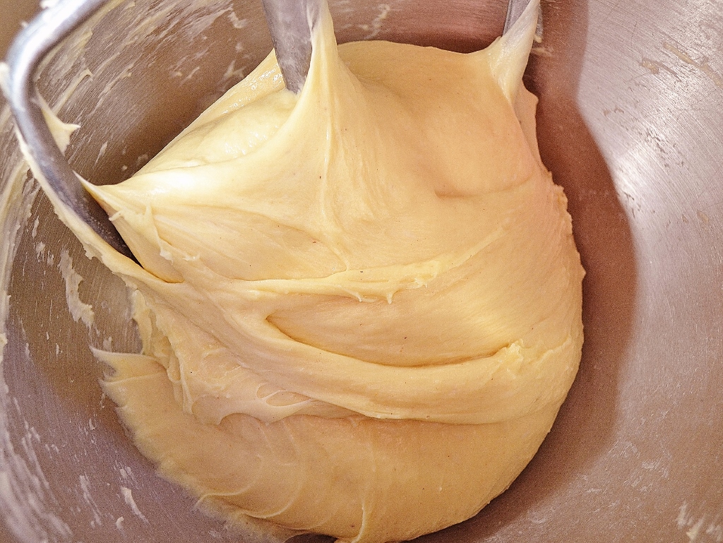 Fouetter le beurre fondu, le jaune d’oeuf et la vanille dans le mélange de levure.