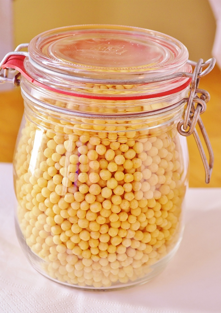 Le couscous de Jérusalem, ou couscous israélien, ou encore couscous perle (voir image ci-dessus) se cuit à la manière des pâtes, en environ 25 minutes. Une fois cuit ses billes ont la grosseur des petits pois. Je l’ai essayé en salade et aussi chaud, comme des pâtes, avec crème, asperges, zeste de citron et jambon.  C’est la première fois que je l’utilise dans une soupe et j’ai adoré!