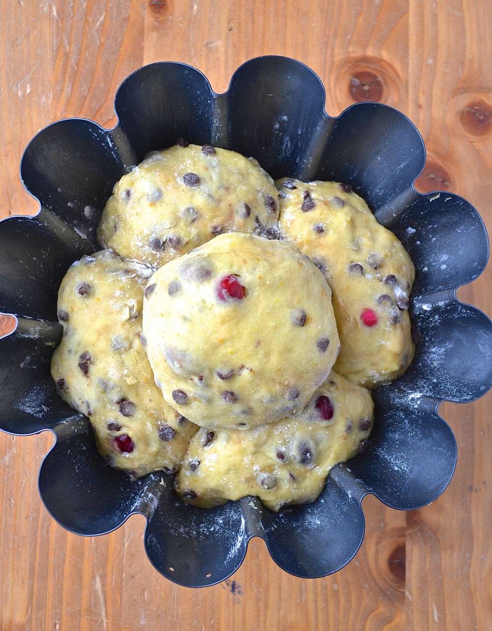 I recently bought a French brioche pan, and couldn’t wait to use it! I have decided to put chocolate chips and fresh cranberries in my brioche, because I think these are the perfect match! The acidity of the fruit goes so well with the rich, sweet taste of chocolate!