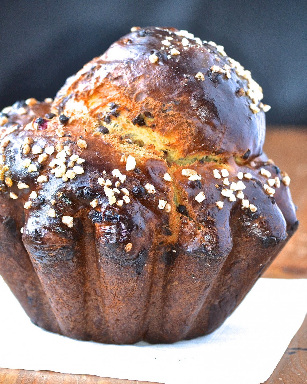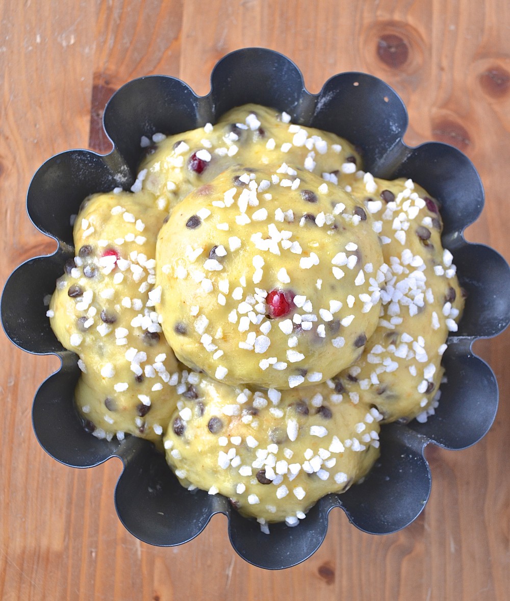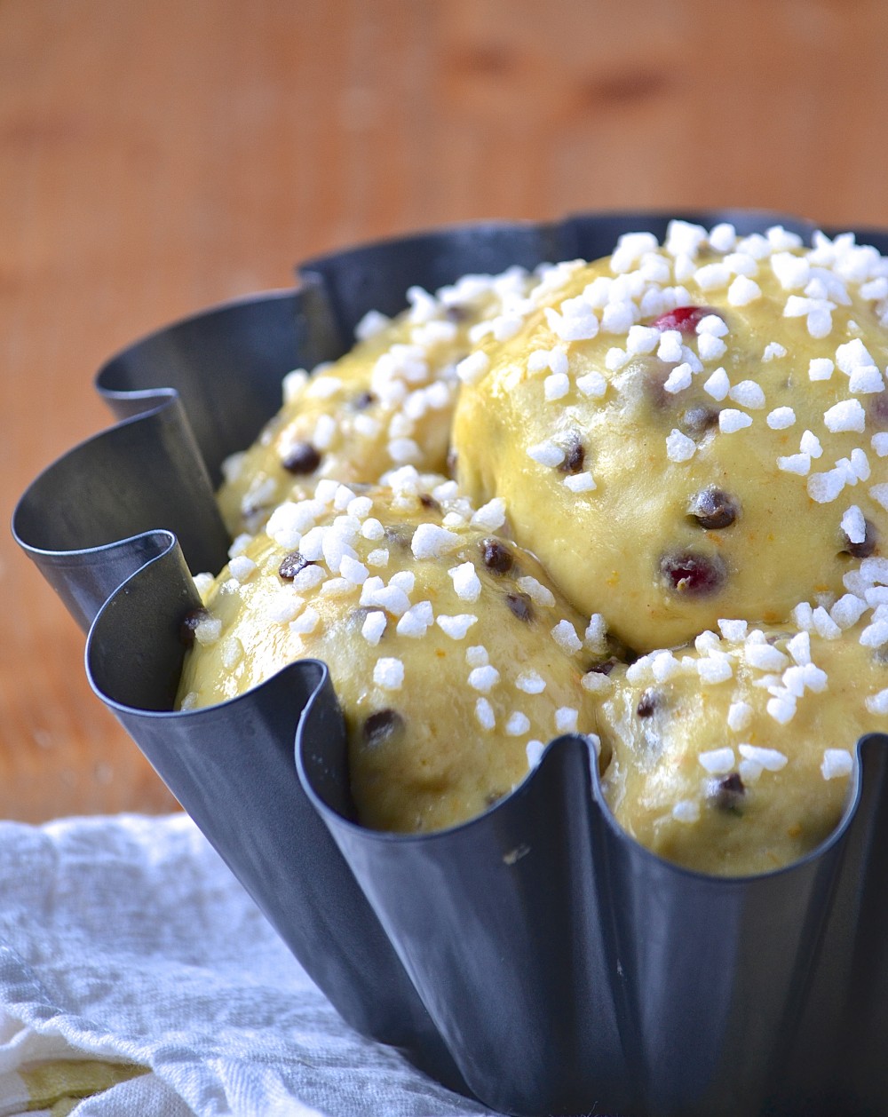 Preheat the oven at 350 F (180 C) and then delicately brush some beaten whole egg on the brioche. Decorate with some sugar grains (the same  you can find on Panetone and other Italian specialties)  if you can find some: it is such a nice final touch!