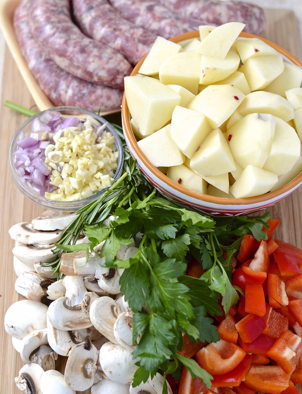 Ajouter les pommes de terres et le poivron rouge aux saucisses dans le plat allant au four. Recouvrir de sauce aux champignons. Couvrir et cuire 1h30 au four. Garnir de persil frais avant le service.