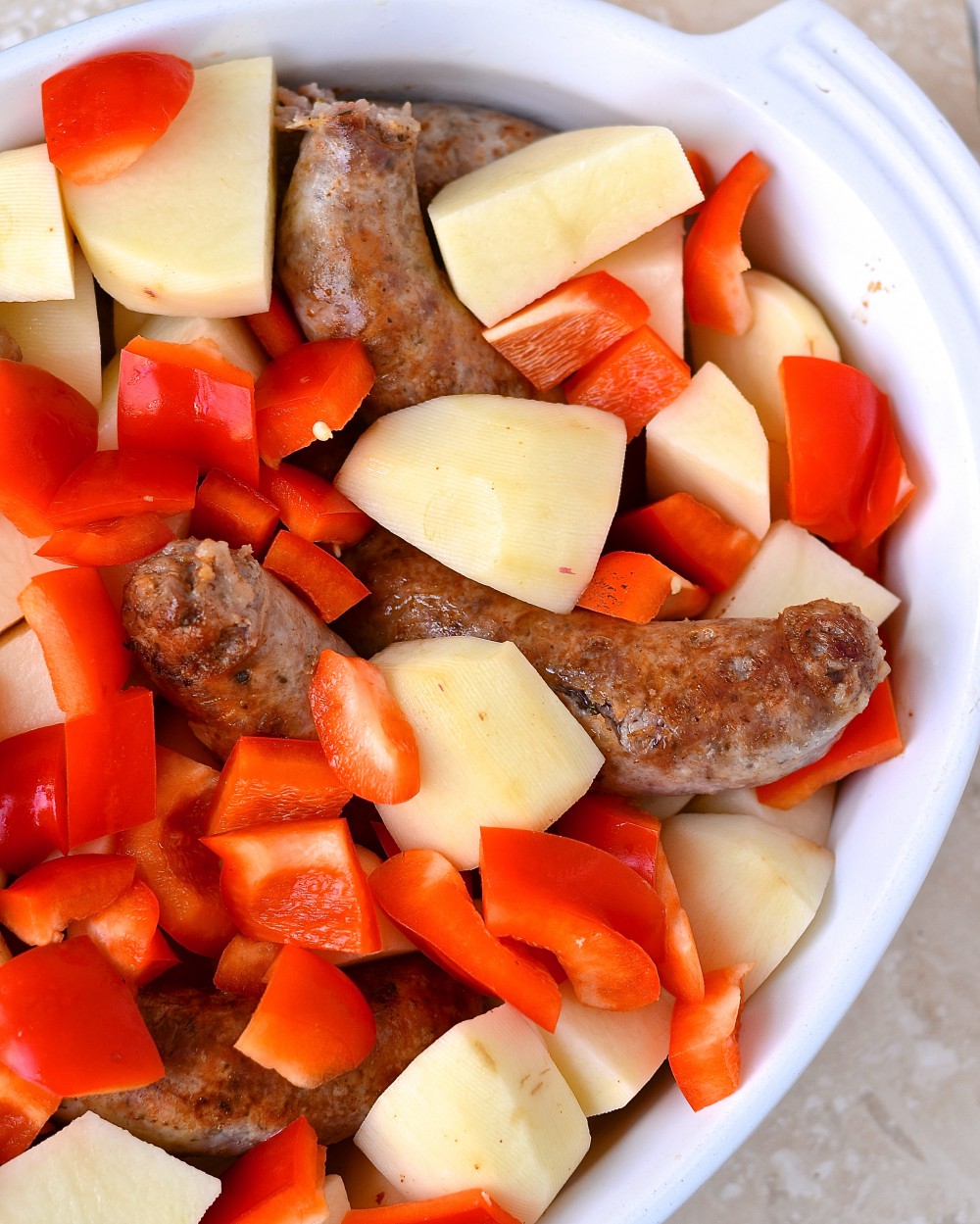 This is such a simple and delicious dish to prepare in the Fall / Winter, you have to try it! Everything bakes together in the oven for 90 minutes, while you are waiting for your guests… It is better to use a sausage that is not too spicy for this recipe, to go with the creamy mustard and rosemary sauce. I have used simple « german » pork sausages (very lightly spiced).