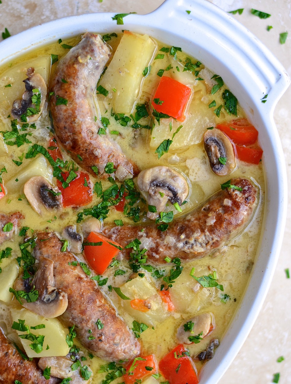 Add the potatoes and the red pepper to the sausages in the ovenproof dish. Pour in the mushroom sauce. Cover the dish and bake for 90 minutes. Sprinkle some parsley before serving. Bon appétit!