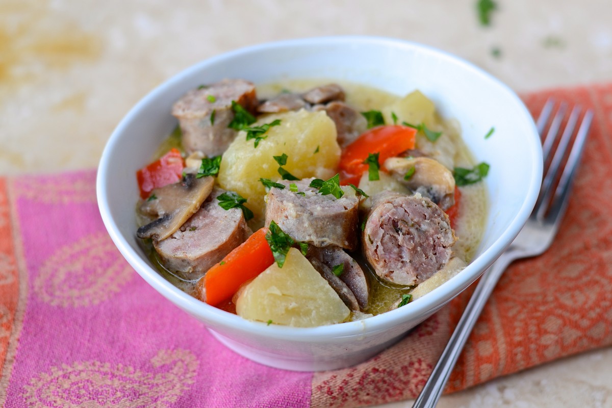Je vous suggère d’utiliser des saucisses douces pour ce plat, pour un heureux mariage avec le vin blanc, la crème et la moutarde… J’ai acheté des saucisses « allemandes » (de simples saucisses de porc sans épices fortes) chez Adonis. La recette originale propose des saucisses de Toulouse. Évitez les italiennes piquantes ou encore les merguez…