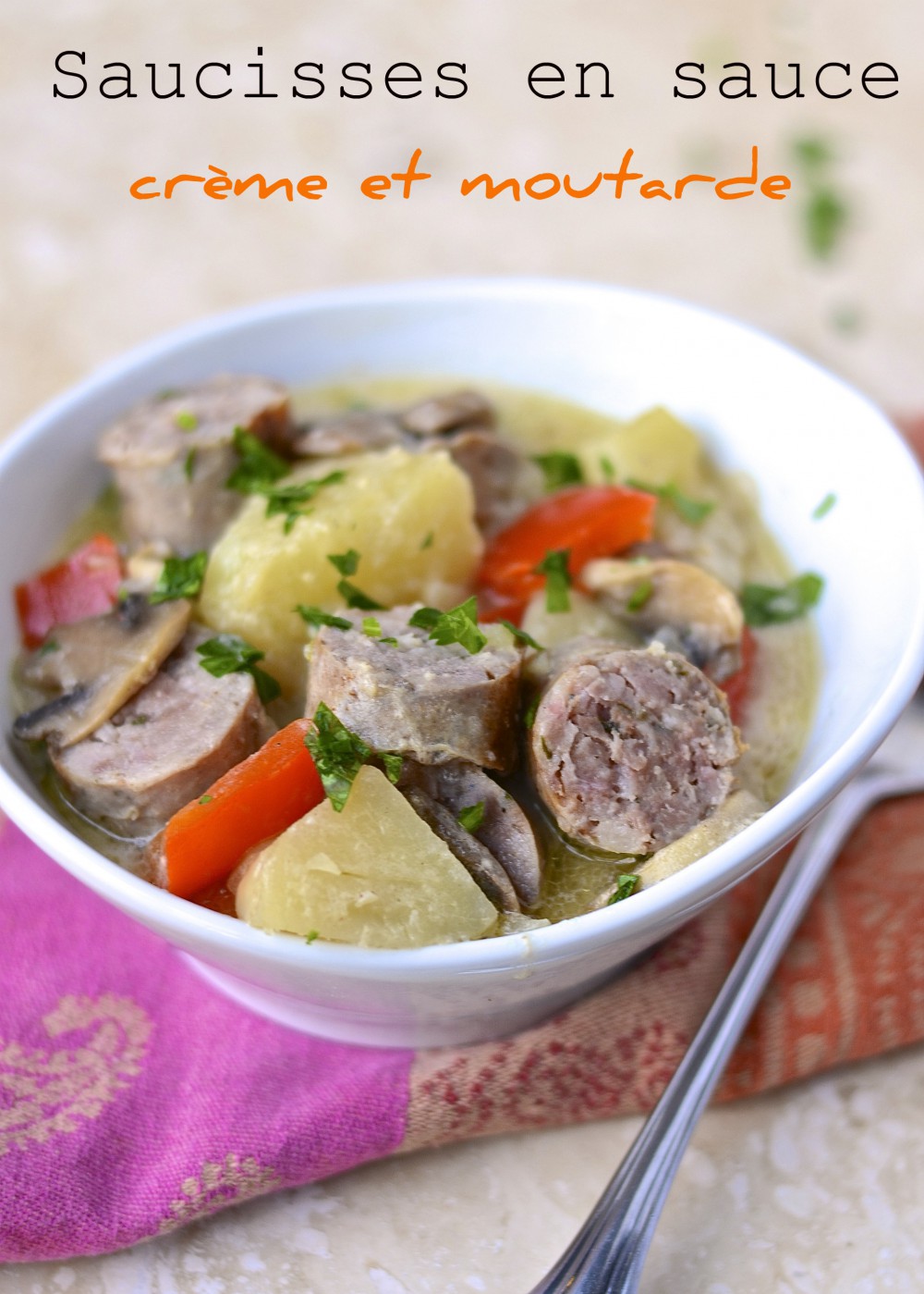 CREAM AND MUSTARD SAUSAGE CASSEROLE (Scroll down for the recipe in English)… Voici une belle recette d’automne sans chichis, où des ingrédients appréciés par pas mal tout le monde – saucisses, moutarde, crème, pommes de terre… – cuisent doucement au four en attendant la visite. Comme la plupart des mijotés, ce plat est encore plus savoureux le lendemain! Merci à Candice de m’avoir partagé cette recette 🙂